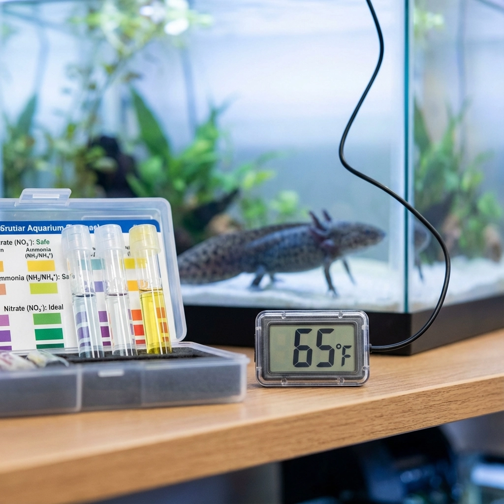 Test water parameters weekly using liquid test kits. Strip tests provide insufficient accuracy for axolotl care. Digital thermometers offer better precision than glass thermometers.